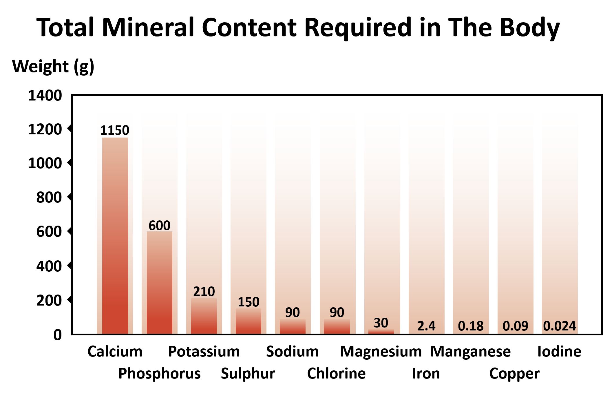 Some minerals, known as macro-minerals, such as calcium, magnesium and potassium are required in larger amounts. Other minerals, known as micro-minerals or trace elements, such as chromium, copper, iron, manganese and zinc, are only required in small or tiny amounts.